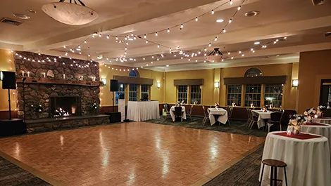Located on the second floor of The Country Inn, the Fisher Room is a traditional ballroom that can accommodate up to 130 wedding guests. This 1,700 sq. ft. wedding reception venue also features an adjacent fireside lounge with comfortable couches and chairs overlooking breathtaking mountain views. The private lounge is perfect for your cocktail reception or extra space for guests who need to take a break from the party.